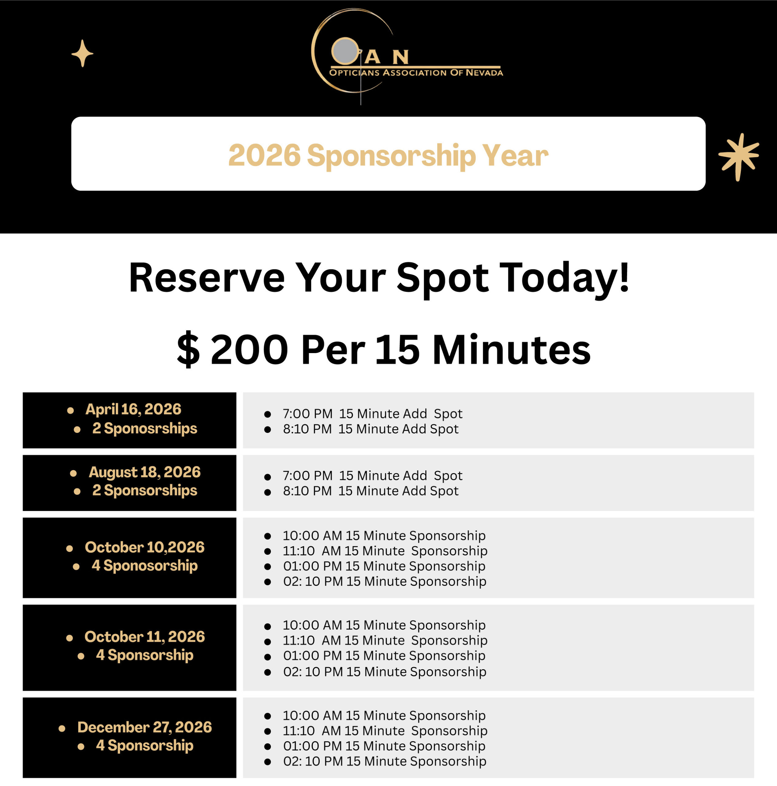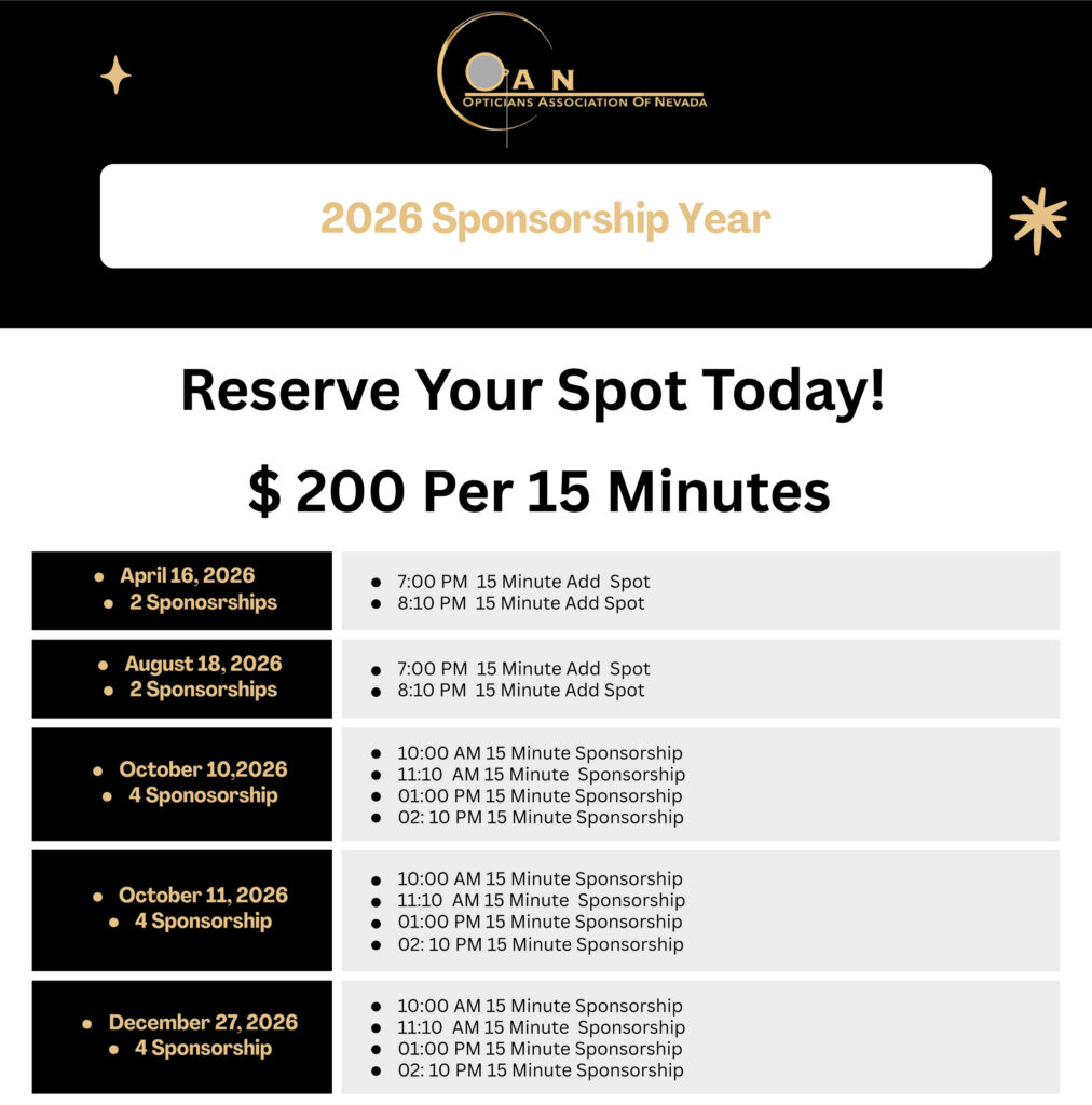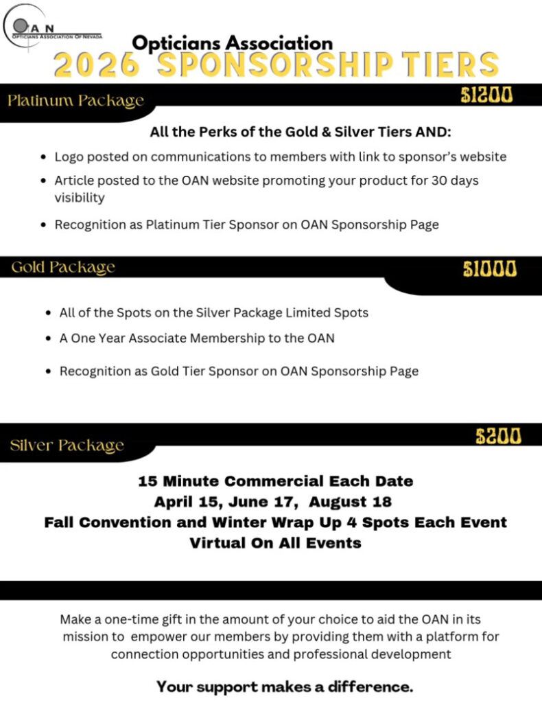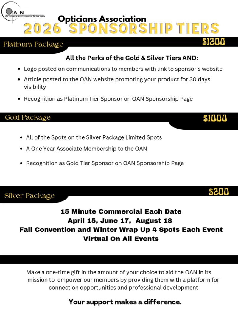 Sponsorship Registration. Register Below and Join Other Industry Leaders in Sponsoring the Opticians Association of Nevada! 2025 Sponsorship Registration Form Contact DetailsDate(Required) MM slash DD slash YYYY Company Name(Required) Company Rep Name(Required) First Last Email(Required) Enter Email Confirm Email Phone(Required)Corporate Address Street Address Address Line 2 City State / Province / Region ZIP / Postal Code Payment DetailsIn-Person or Online Sponsorship(Required) $1500 (Platinum Package) $1000 (Gold Package) $500 (Silver Package) $200 (April 15 webinar for 15 minutes) Payment MethodPayPal Checkout American ExpressDiscoverMasterCardVisaSupported Credit Cards: American Express, Discover, MasterCard, Visa Card Number Expiration Date Security Code Cardholder Name Total