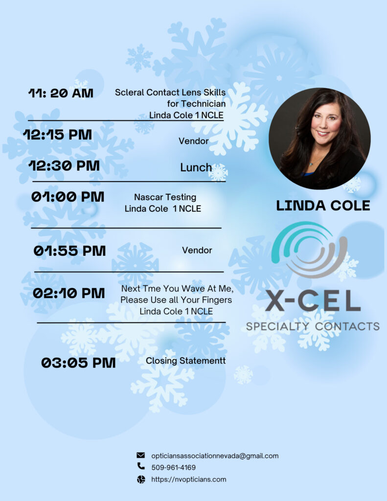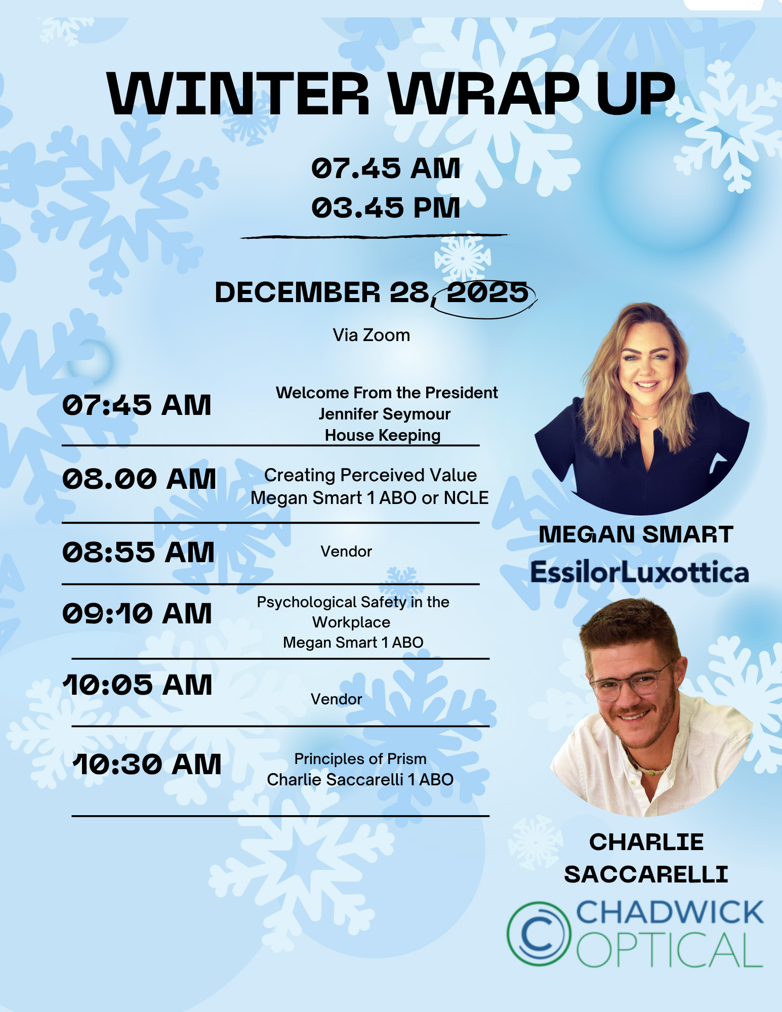 Winter Wrap Up 2025 Register Below! Speakers Megan Smart and Charlie Saccarelli Speaker, Linda Cole 2025 Winter Wrap Up Registration, December 28 December 28, 2025 Name(Required) First Last Phone(Required)Email(Required) Address(Required) Street Address City State / Province / Region ZIP / Postal Code AfghanistanAlbaniaAlgeriaAmerican SamoaAndorraAngolaAnguillaAntarcticaAntigua and BarbudaArgentinaArmeniaArubaAustraliaAustriaAzerbaijanBahamasBahrainBangladeshBarbadosBelarusBelgiumBelizeBeninBermudaBhutanBoliviaBonaire, Sint Eustatius and SabaBosnia and HerzegovinaBotswanaBouvet IslandBrazilBritish Indian Ocean TerritoryBrunei DarussalamBulgariaBurkina FasoBurundiCabo VerdeCambodiaCameroonCanadaCayman IslandsCentral African RepublicChadChileChinaChristmas IslandCocos IslandsColombiaComorosCongoCongo, Democratic Republic of theCook IslandsCosta RicaCroatiaCubaCuraçaoCyprusCzechiaCôte d'IvoireDenmarkDjiboutiDominicaDominican RepublicEcuadorEgyptEl SalvadorEquatorial GuineaEritreaEstoniaEswatiniEthiopiaFalkland IslandsFaroe IslandsFijiFinlandFranceFrench GuianaFrench PolynesiaFrench Southern TerritoriesGabonGambiaGeorgiaGermanyGhanaGibraltarGreeceGreenlandGrenadaGuadeloupeGuamGuatemalaGuernseyGuineaGuinea-BissauGuyanaHaitiHeard Island and McDonald IslandsHoly SeeHondurasHong KongHungaryIcelandIndiaIndonesiaIranIraqIrelandIsle of ManIsraelItalyJamaicaJapanJerseyJordanKazakhstanKenyaKiribatiKorea, Democratic People's Republic ofKorea, Republic ofKuwaitKyrgyzstanLao People's Democratic RepublicLatviaLebanonLesothoLiberiaLibyaLiechtensteinLithuaniaLuxembourgMacaoMadagascarMalawiMalaysiaMaldivesMaliMaltaMarshall IslandsMartiniqueMauritaniaMauritiusMayotteMexicoMicronesiaMoldovaMonacoMongoliaMontenegroMontserratMoroccoMozambiqueMyanmarNamibiaNauruNepalNetherlandsNew CaledoniaNew ZealandNicaraguaNigerNigeriaNiueNorfolk IslandNorth MacedoniaNorthern Mariana IslandsNorwayOmanPakistanPalauPalestine, State ofPanamaPapua New GuineaParaguayPeruPhilippinesPitcairnPolandPortugalPuerto RicoQatarRomaniaRussian FederationRwandaRéunionSaint BarthélemySaint Helena, Ascension and Tristan da CunhaSaint Kitts and NevisSaint LuciaSaint MartinSaint Pierre and MiquelonSaint Vincent and the GrenadinesSamoaSan MarinoSao Tome and PrincipeSaudi ArabiaSenegalSerbiaSeychellesSierra LeoneSingaporeSint MaartenSlovakiaSloveniaSolomon IslandsSomaliaSouth AfricaSouth Georgia and the South Sandwich IslandsSouth SudanSpainSri LankaSudanSurinameSvalbard and Jan MayenSwedenSwitzerlandSyria Arab RepublicTaiwanTajikistanTanzania, the United Republic ofThailandTimor-LesteTogoTokelauTongaTrinidad and TobagoTunisiaTurkmenistanTurks and Caicos IslandsTuvaluTürkiyeUS Minor Outlying IslandsUgandaUkraineUnited Arab EmiratesUnited KingdomUnited StatesUruguayUzbekistanVanuatuVenezuelaViet NamVirgin Islands, BritishVirgin Islands, U.S.Wallis and FutunaWestern SaharaYemenZambiaZimbabweÅland Islands Country EmployerWinter Wrap Up(Required) Register for Event Option(Required) Creating Perceived Value (8am-9am, 1 ABO or 1 NCLE) – $10 Psychological Safety in the Workplace (9am-10am, 1 ABO) – $10 Principals of Prism (10:30-11:30, 1 ABO) – $10 Scleral Contact Lens Skills for Technician (11:30-12:30, 1 NCLE) – $10 Nascar Testing (1pm-2pm, 1 NCLE – $10 Next Time You Wave At Me, Please Use All of Your Fingers (2pm-3pm, NCLE) – $10 Winter Wrap Up Apprentices / Students – Free Total CAPTCHAIf you do not want a PayPal account, choose the Debit or Credit Card option. Continue as guest and UNCHECK the box that says, “Create my PayPal account for Purchase Protection on eligible purchases”.Payment MethodPayPal Checkout MasterCardVisaSupported Credit Cards: MasterCard, Visa Card Number Expiration Date Security Code Cardholder Name